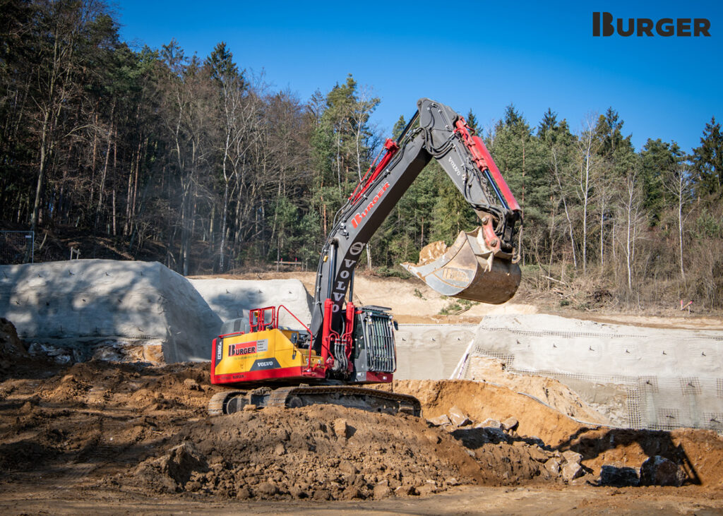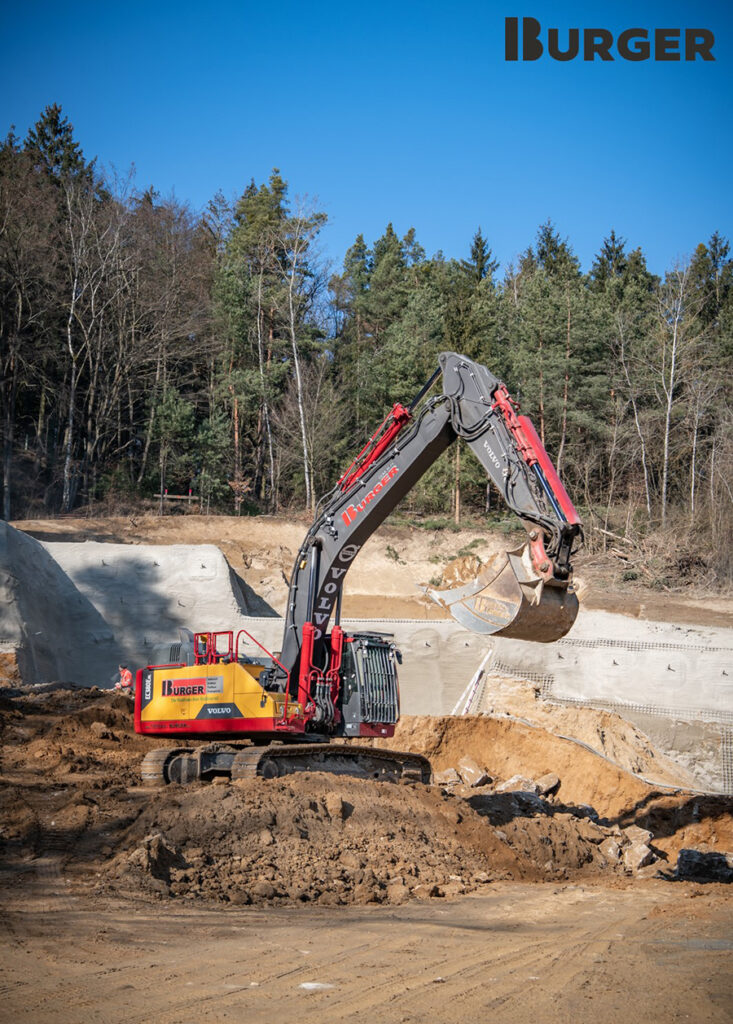 Sowohl für die Aushub- und Planierarbeiten als auch für die Hinterfüllungsarbeiten auf dieser Baustelle wurde die Firma Tiefbau Burger beauftragt. In Hanglage werden von uns ca. 15.000m³ Aushub bewegt. Die Besonderheit bei dieser Baustelle ist eine Hinterfüllung mit Flüssigboden, um die Erdwärme effektiv zu nutzen. Das zur Wiederverfüllung vorgesehene, ausgehobene Bodenmaterial wird mittels Zugabe von Bindemittel und Wasser fließfähig gemacht und mittels Pumpe im Arbeitsgraben eingebracht.