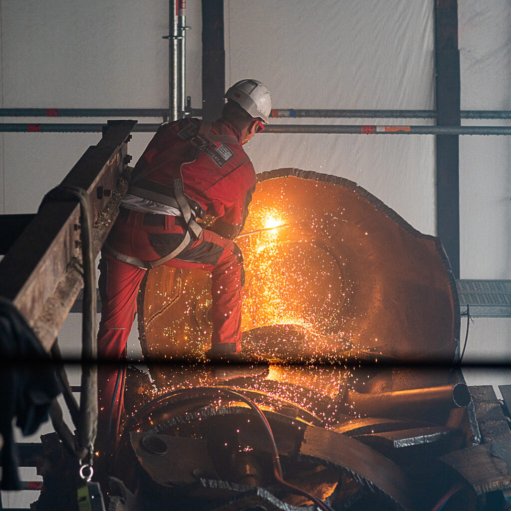 Präzision im Bestand: In sensiblen Innenbereichen arbeiten wir mit spezialisierten, elektrisch betriebenen Werkzeugen. Das ermöglicht uns einen erschütterungsarmen und präzisen Rückbau, ohne die restliche Bausubstanz unnötig zu belasten.